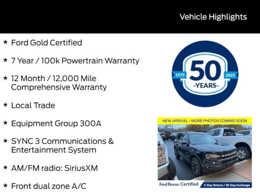 Recent Arrival! 2023 Ford Bronco Sport Outer Banks 1.5L EcoBoost 8-Speed Automatic 4WD 4D Sport Utility Shadow Black Ford Gold Certified, 7 Year / 100k Powertrain Warranty, 12 Month / 12,000 Mile Comprehensive Warranty, Local Trade, AM/FM radio: SiriusXM, Automatic temperature control, Equipment Group 300A, Front Bucket Seats, Front dual zone A/C, Front fog lights, Heated door mirrors, Heated front seats, Heated steering wheel, Power door mirrors, Power driver seat, Power passenger seat, Power windows, Rear window defroster, Remote keyless entry, Speed control, SYNC 3 Communications & Entertainment System, SYNC 3/Apple CarPlay/Android Auto, Wheels: 18" Ebony Black-Painted Aluminum. 25/28 City/Highway MPG