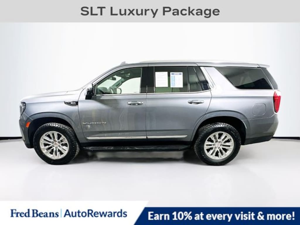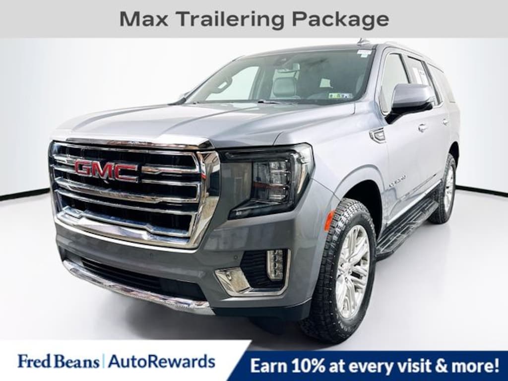 2022 GMC Yukon SLT EcoTec3 5.3L V8 10-Speed Automatic with Overdrive 4WD 4D Sport Utility Satin Steel Metallic 4WD, 2 Presets For Outside Rearview Mirrors, 2 Presets For Power Driver Seat, 3rd Row 60/40 Power-Folding Split-Bench Seat, Automatic Stop/Start, Bose 9-Speaker Stereo Audio System Feature, Bright Chrome Bodyside Moldings, Bright Front & Rear Door Sill Plates, Chrome Door Handles w/Body-Color Strip, Hands-Free Power Programmable Rear Liftgate, HD Surround Vision, Heated & Ventilated Driver & Front Passenger Seats, Heated 2nd Row Outboard Position Seats, Heated Driver & Front Passenger Seats, Heated Steering Wheel, Inside Rear-View Auto-Dimming Mirror, Max Trailering Package, Outside Heated Power-Adjustable Mirrors, Power Release 2nd Row 60/40 Split-Folding Bench Seat, Power Tilt & Telescopic Steering Column, Preferred Equipment Group 4SA, Rear Pedestrian Alert, Safety Alert Seat, SLT Luxury Package, Start/Stop System Disable Button, Universal Home Remote, Wireless Charging.