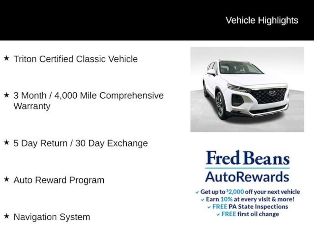 Discover the ultimate driving experience with this exceptional 2020 Hyundai Santa Fe Limited. Boasting a sophisticated 2.0L Turbocharged engine and all-wheel-drive capability, this SUV is ready to conquer the road with power and efficiency.- 3 Month / 4,000 Mile Comprehensive Warranty- 5 Day Return / 30 Day Exchange- Auto Reward Program- Triton Certified Classic Vehicle- CARGO PACKAGE- CARPETED FLOOR MATS- CARGO COVER- BUMPER APPLIQUE- Navigation SystemBeyond its impressive performance, this Santa Fe Limited is packed with an array of premium features that elevate the driving experience. Indulge in the convenience of the Heads-Up Display, the comfort of the heated and ventilated front seats, and the connectivity of Apple CarPlay and Android Auto. The spacious interior, with its leather seating surfaces and power liftgate, ensures both style and practicality.Safety is paramount, and this Santa Fe delivers with a suite of advanced driver-assistance technologies. Enjoy the peace of mind of features like Automatic Emergency Braking, Lane Keeping Assist, and Blind Spot Monitoring, all working tirelessly to keep you and your loved ones secure on the road.With its striking Quartz White exterior and well-appointed cabin, this 2020 Hyundai Santa Fe Limited is a true head-turner. Its exceptional fuel efficiency, boasting 20 city and 26 highway MPG, makes it both environmentally conscious and budget-friendly.Discover the perfect blend of power, technology, and style with this remarkable 2020 Hyundai Santa Fe Limited. Experience the difference for yourself by scheduling a test drive today. We're confident you'll be impressed by its exceptional capabilities and luxurious amenities.