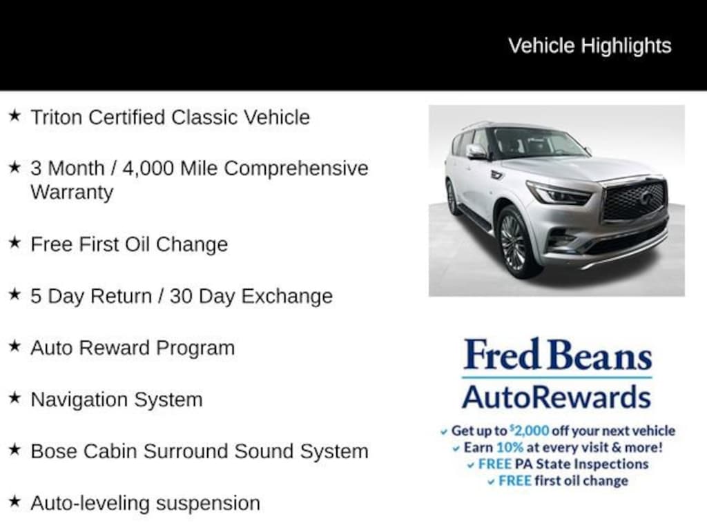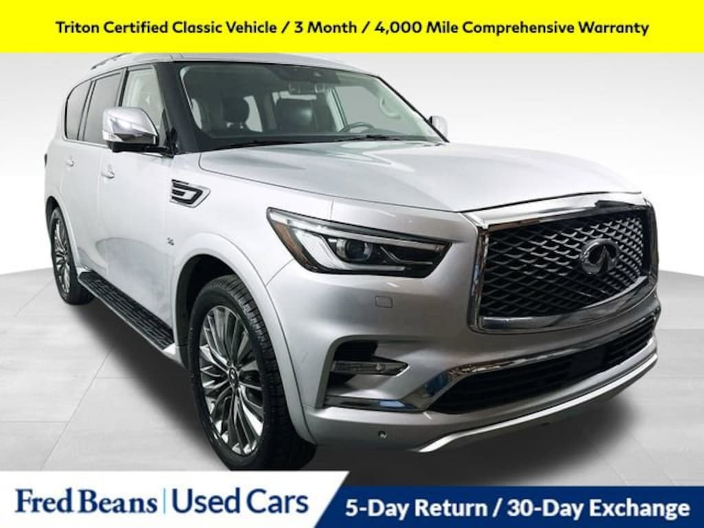 Experience the pinnacle of luxury and performance with this exceptional 2018 INFINITI QX80 Base. Boasting a powerful 5.6L V8 engine, 7-speed automatic transmission, and commanding 4-wheel drive, this SUV delivers a thrilling driving experience that will leave you in awe. Triton Certified Classic Vehicle 3 Month / 4,000 Mile Comprehensive Warranty Free First Oil Change 5 Day Return / 30 Day Exchange Auto Reward Program Deluxe Technology Package Driver Assistance Package Theater Package Tire & Wheel Package Bose Cabin Surround Sound System Hydraulic Body Motion Control SystemThis QX80 is meticulously certified, ensuring you can purchase with confidence. Our rigorous inspection process and comprehensive warranty provide the peace of mind you deserve. Indulge in the unparalleled comfort and convenience of features like the climate-controlled front seats, advanced climate control system, and smart rear-view mirror.Elevate your driving experience with the cutting-edge technology that sets this QX80 apart. Enjoy the seamless integration of the navigation system, Bose Cabin Surround Sound System, and dual 8-inch color monitors. Stay connected and entertained on every journey.Safety is paramount, and this QX80 delivers with a comprehensive suite of advanced driver-assistance technologies. From Blind Spot Warning and Backup Collision Intervention to Intelligent Cruise Control and Lane Departure Warning, you'll navigate the roads with confidence and peace of mind.Complement the stunning exterior with the impeccable Espresso/Charcoal Burl interior trim, creating an atmosphere of refined elegance. The 22-inch forged aluminum-alloy wheels and chrome mirror caps add a touch of sophistication that is sure to turn heads.This 2018 INFINITI QX80 Base is a true masterpiece of engineering and design. Experience the ultimate in luxury, performance, and technology. Visit our showroom today and let us demonstrate why this exceptional SUV is the perfect addition to your lifestyle.