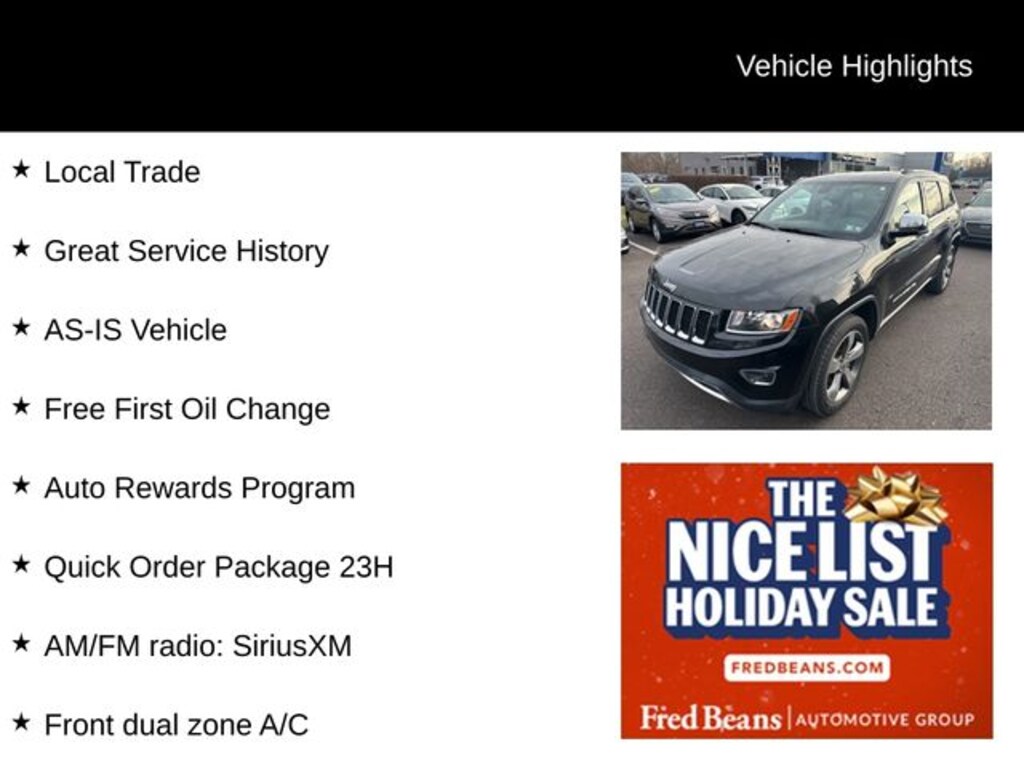 Recent Arrival! 2014 Jeep Grand Cherokee Limited Limited 3.6L V6 Flex Fuel 24V VVT 8-Speed Automatic 4WD 4D Sport Utility Brilliant Black Crystal Pearlcoat Local Trade, Great Service History, AS-IS Vehicle, Free First Oil Change, Auto Rewards Program, 4WD, Alloy wheels, AM/FM radio: SiriusXM, Driver Power Memory/Passenger Man. Fold Flat Seat, Exterior Parking Camera Rear, Front dual zone A/C, Fully automatic headlights, Heated door mirrors, Heated front seats, Heated rear seats, Heated steering wheel, Illuminated entry, Leather Shift Knob, Memory seat, Power door mirrors, Power driver seat, Power Liftgate, Power passenger seat, Premium Leather Trimmed Bucket Seats, Quick Order Package 23H, Remote keyless entry, Single Pane Power Sunroof, Steering wheel mounted audio controls, Turn signal indicator mirrors.